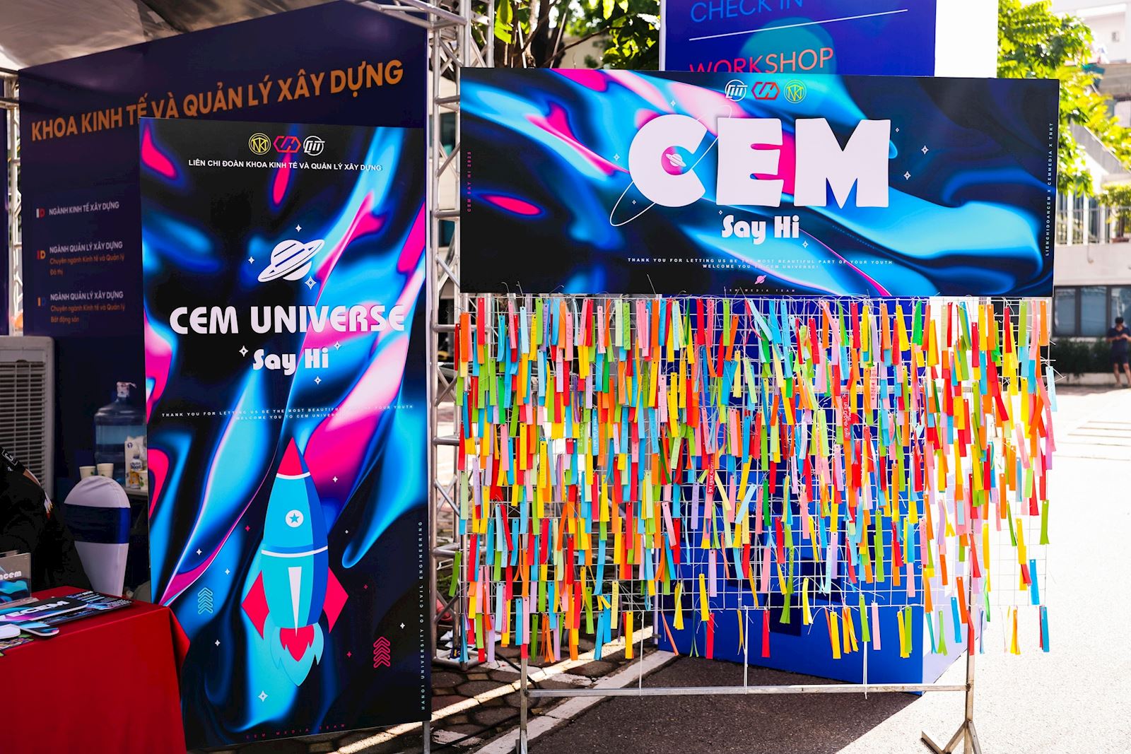 Tại sự kiện HUCE Open Day 2025, bên cạnh hoạt động tư vấn tuyển sinh, giải đáp những thắc mắc của các bạn học sinh THPT và các quý vị phụ huynh, gian trại của Khoa Kinh tế và Quản lý Xây dựng (CEM) còn đặc biệt chuẩn bị và mang đến sự kiện một không gian tương tác đầy thú vị và sáng tạo, nơi mỗi bạn trẻ có thể gửi gắm những ước mơ và lưu giữ lại những khoảnh khắc đáng nhớ trong hành trình khám phá HUCE.