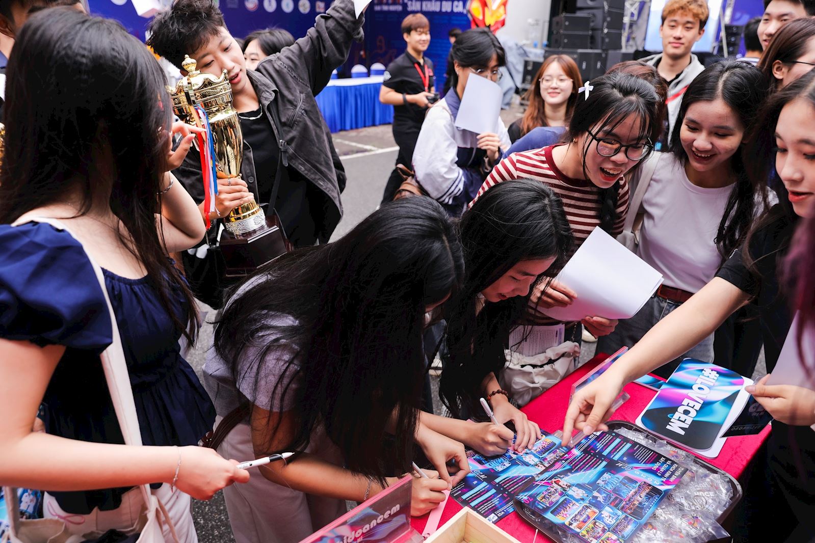 ► Hoạt động chụp ảnh lưu giữ khoảnh khắc tại khu vực Check-in “CEM Say Hi” do Nhà CEM chuẩn bị cũng trở thành địa điểm “Hot” được rất đông các bạn học sinh săn đón. Không gian khu vực checkin được thiết kế tràn ngập sắc màu rực rỡ, bắt mắt, hợp trend cùng những chiếc cúp vàng "lấy vía", backdrop sáng tạo. Tất cả đã tạo nên một không gian không chỉ đơn thuần là nơi để lưu giữ lại những bức ảnh kỷ niệm, mà còn là dịp để các bạn học sinh THPT có môi trường và cơ hội để có thể làm quen, kết nối với các thầy cô, các anh chị sinh viên Nhà CEM – Rất có thể đó sẽ là những người thầy, người tiền bối thân thiết sẽ đồng hành cùng các bạn học sinh trong tương lai đại học không xa.